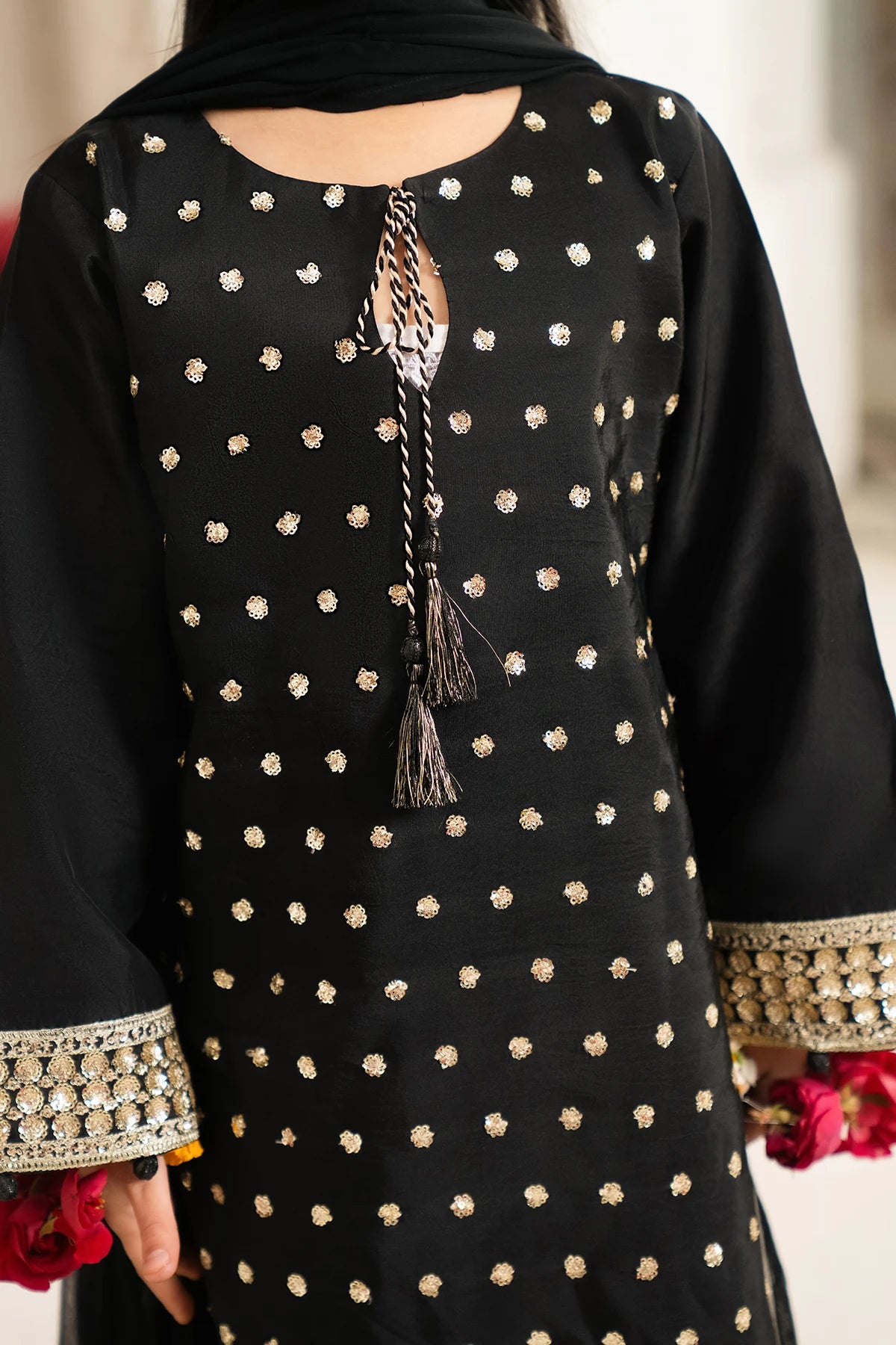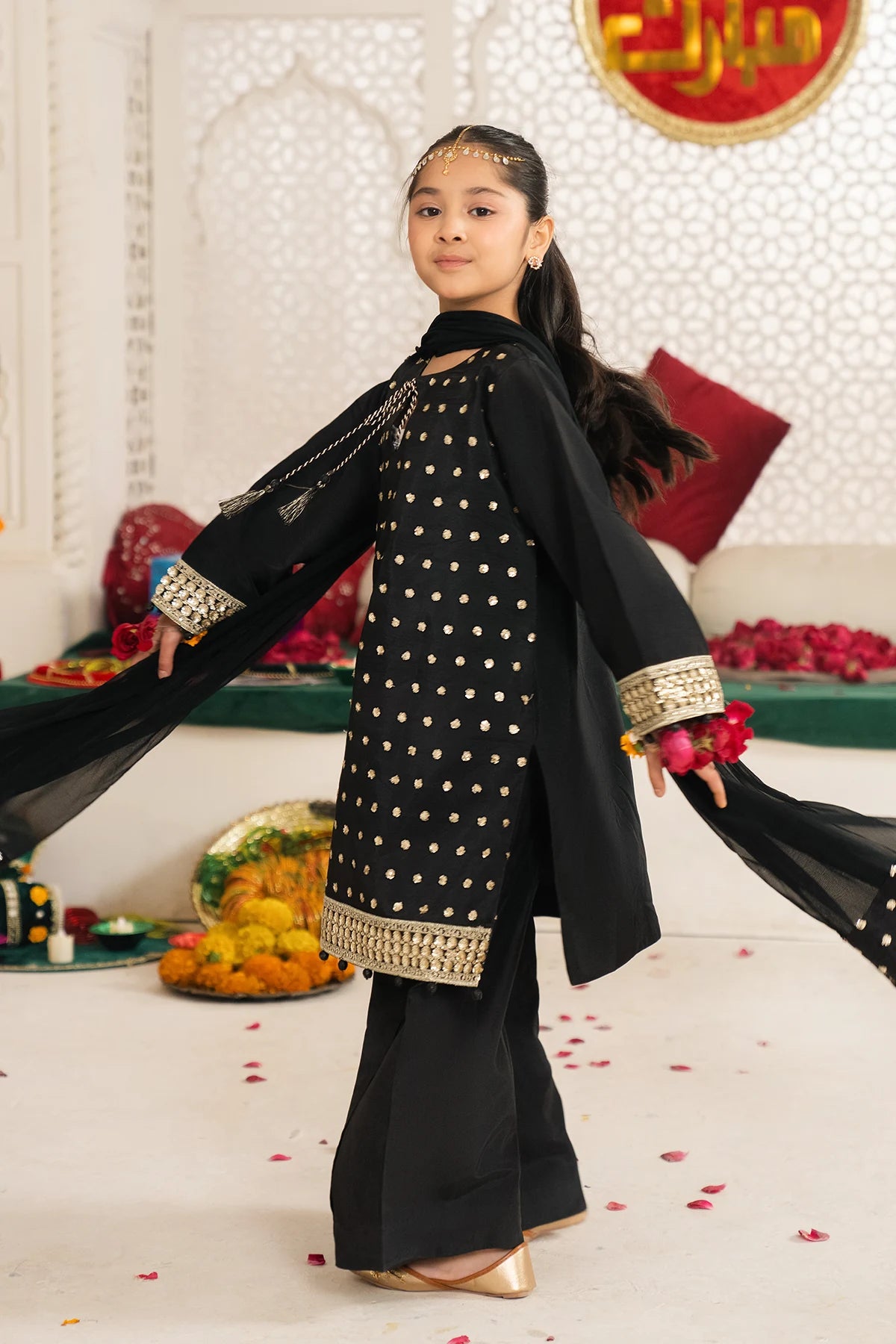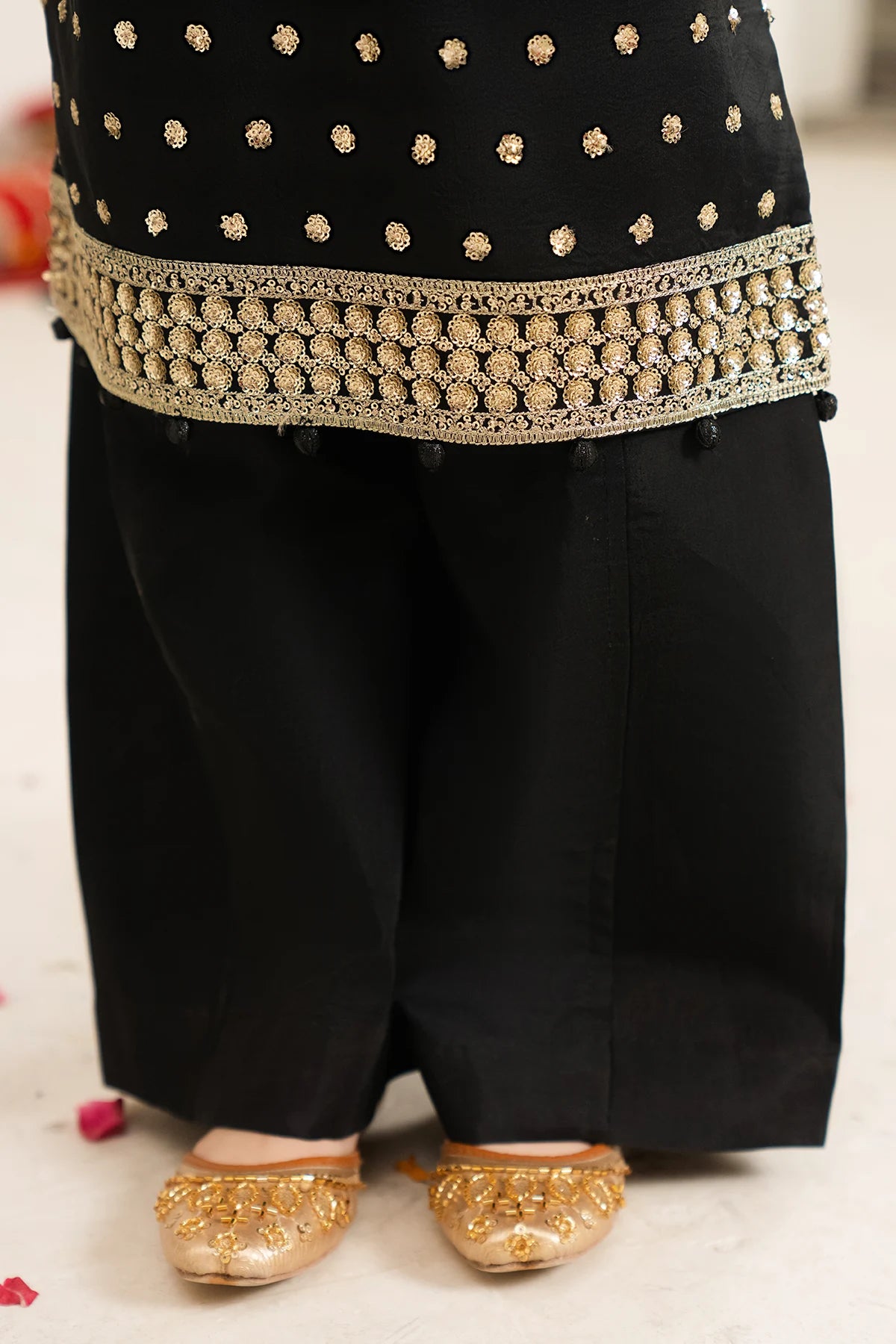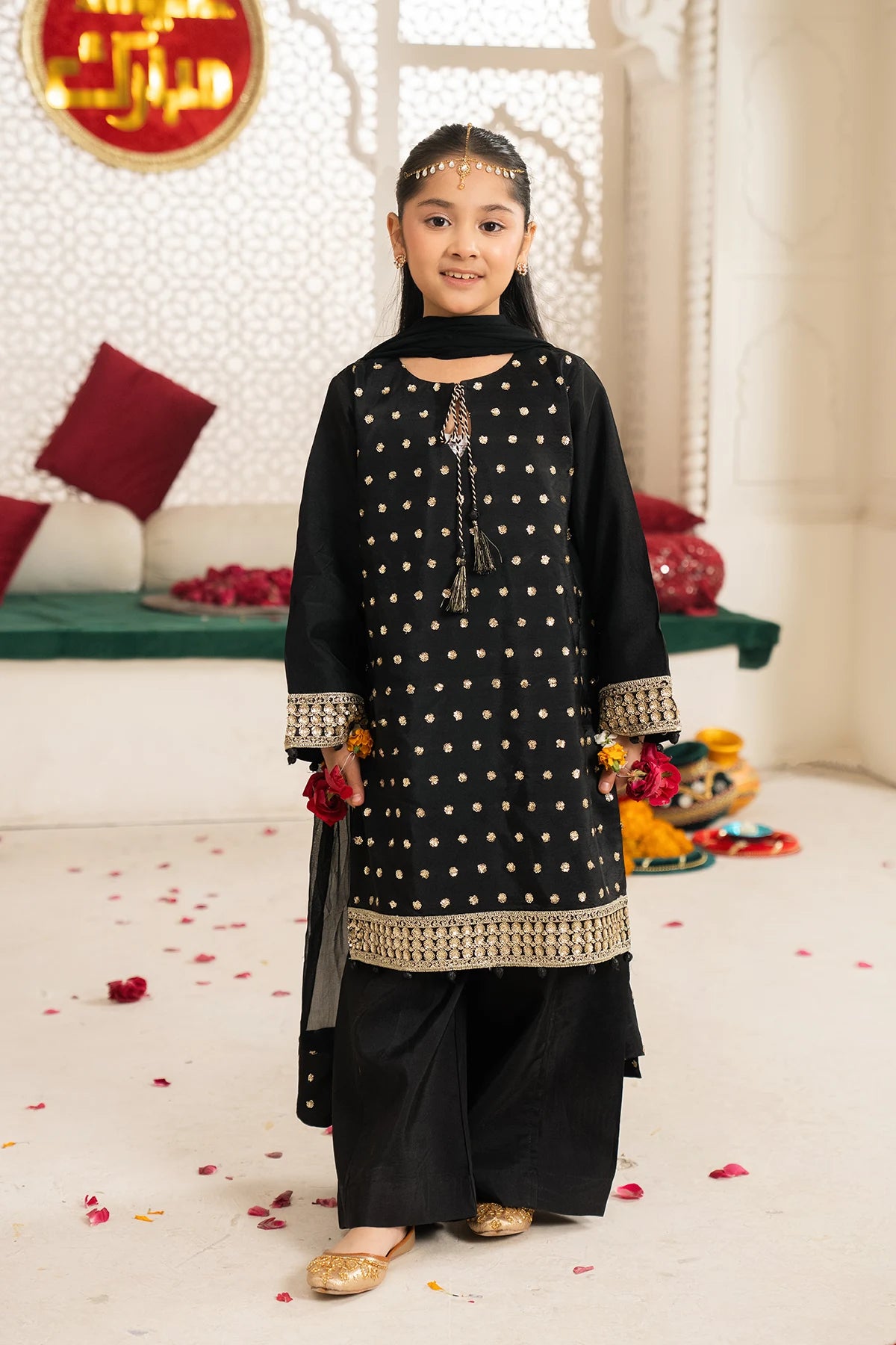 Part of our Exclusive Eid Edition, this luxuriously crafted ensemble features an intricately embroidered Sequin Tasal Silk shirt paired with a matching Tasal Silk embroidered trouser. The delicate net dupatta adds an ethereal finish, creating a timeless and graceful festive look for your little one.