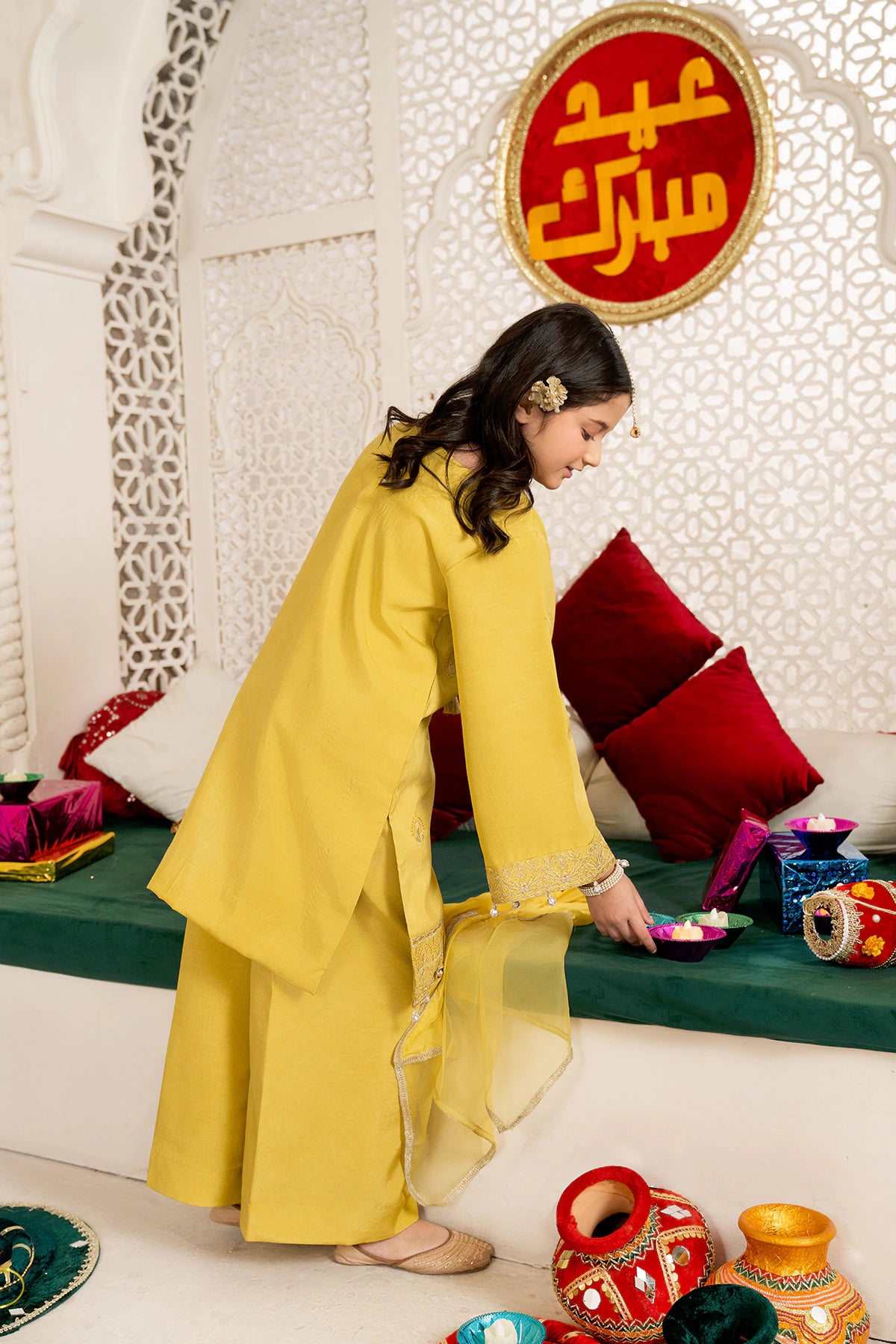 Part of our Exclusive Eid Edition, this luxuriously crafted ensemble features an intricately embroidered Tasal Silk shirt paired with a matching Tasal Silk embroidered trouser. The delicate Organza dupatta adds an ethereal finish, creating a timeless and graceful festive look for your little one.