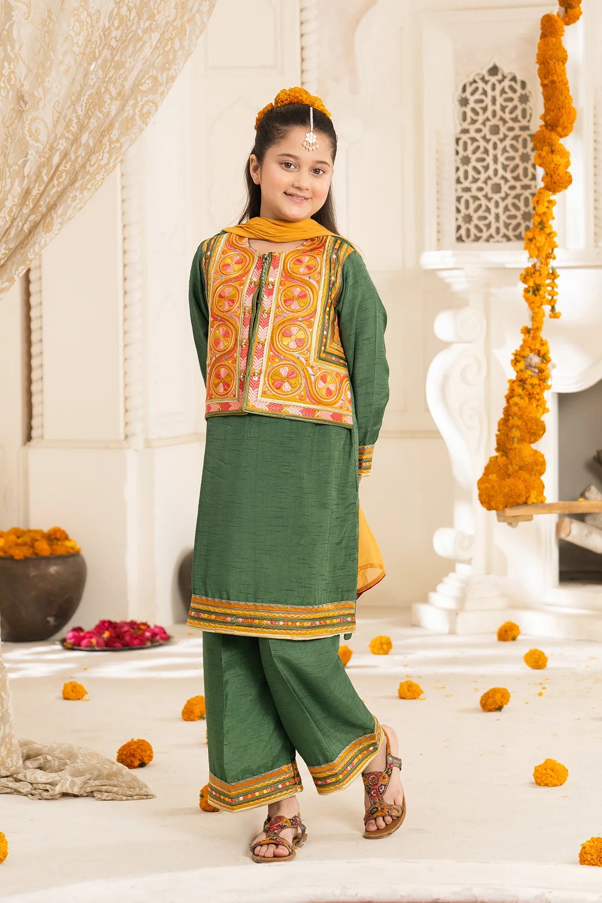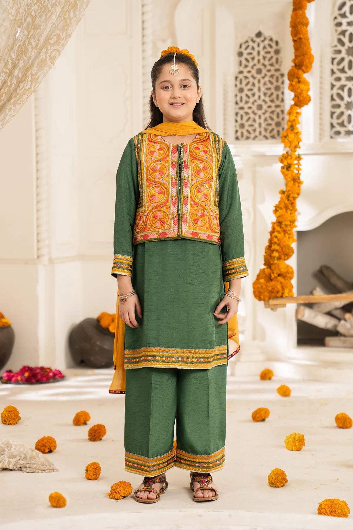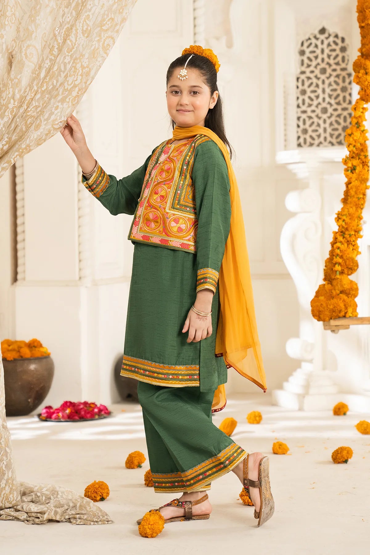 Part of our Exclusive Eid Edition, this luxuriously crafted ensemble features an intricately embroidered Tasal Silk shirt paired with a matching Tasal Silk embroidered trouser. The delicate net dupatta adds an ethereal finish, creating a timeless and graceful festive look for your little one.
