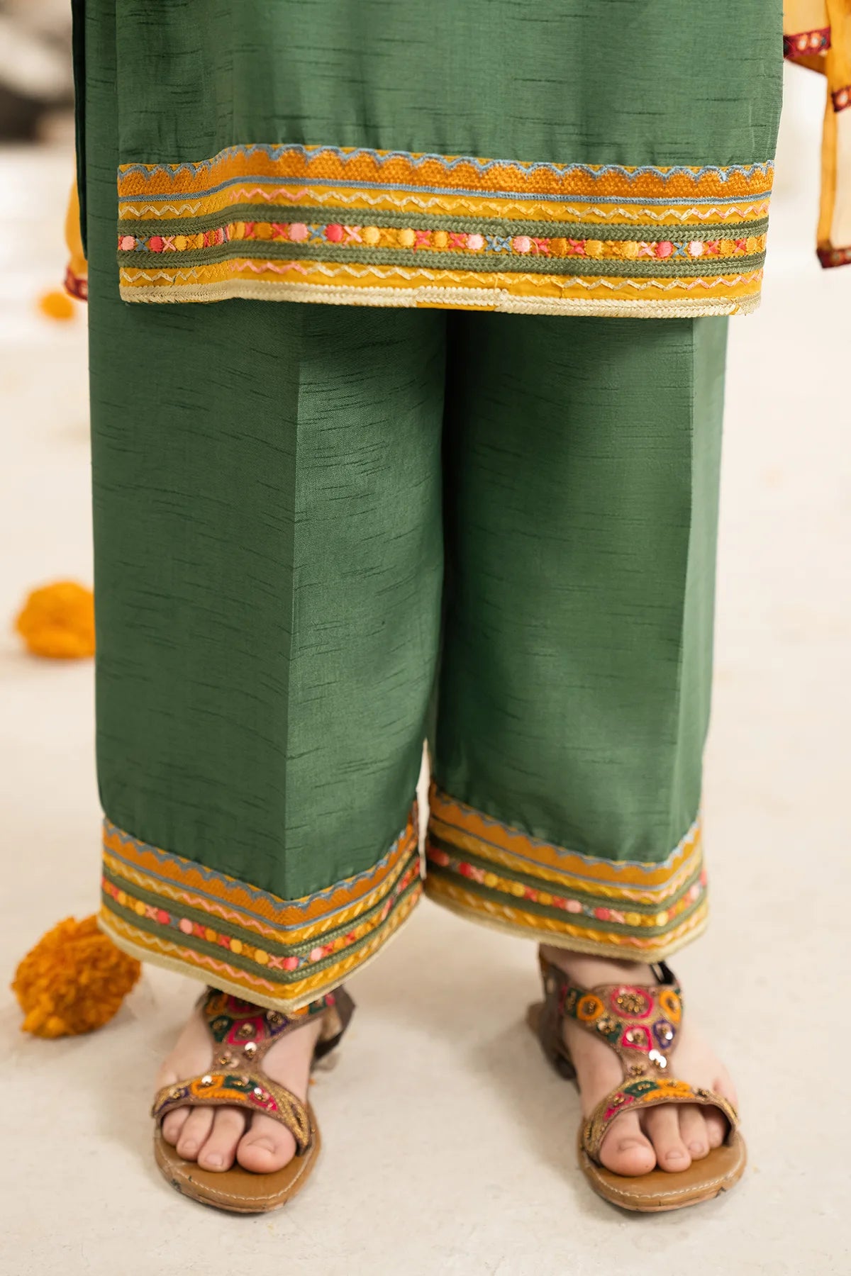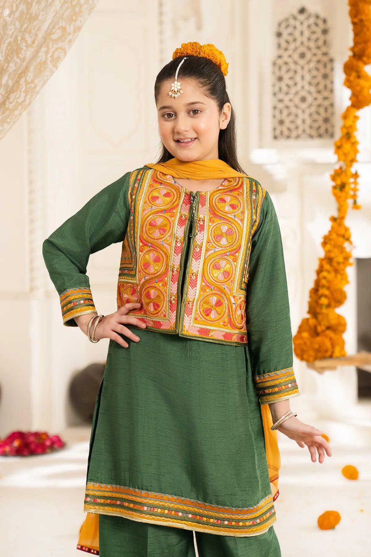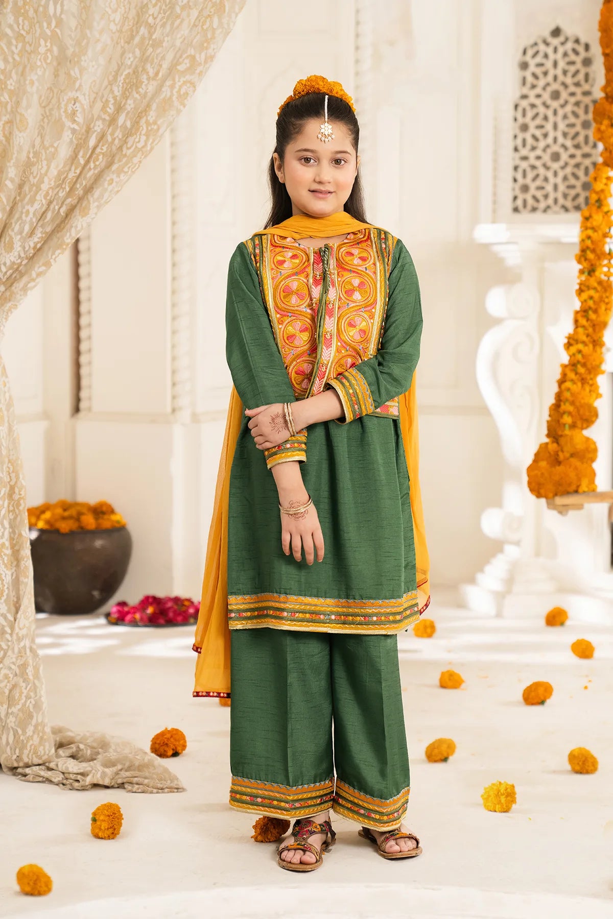 Part of our Exclusive Eid Edition, this luxuriously crafted ensemble features an intricately embroidered Tasal Silk shirt paired with a matching Tasal Silk embroidered trouser. The delicate net dupatta adds an ethereal finish, creating a timeless and graceful festive look for your little one.