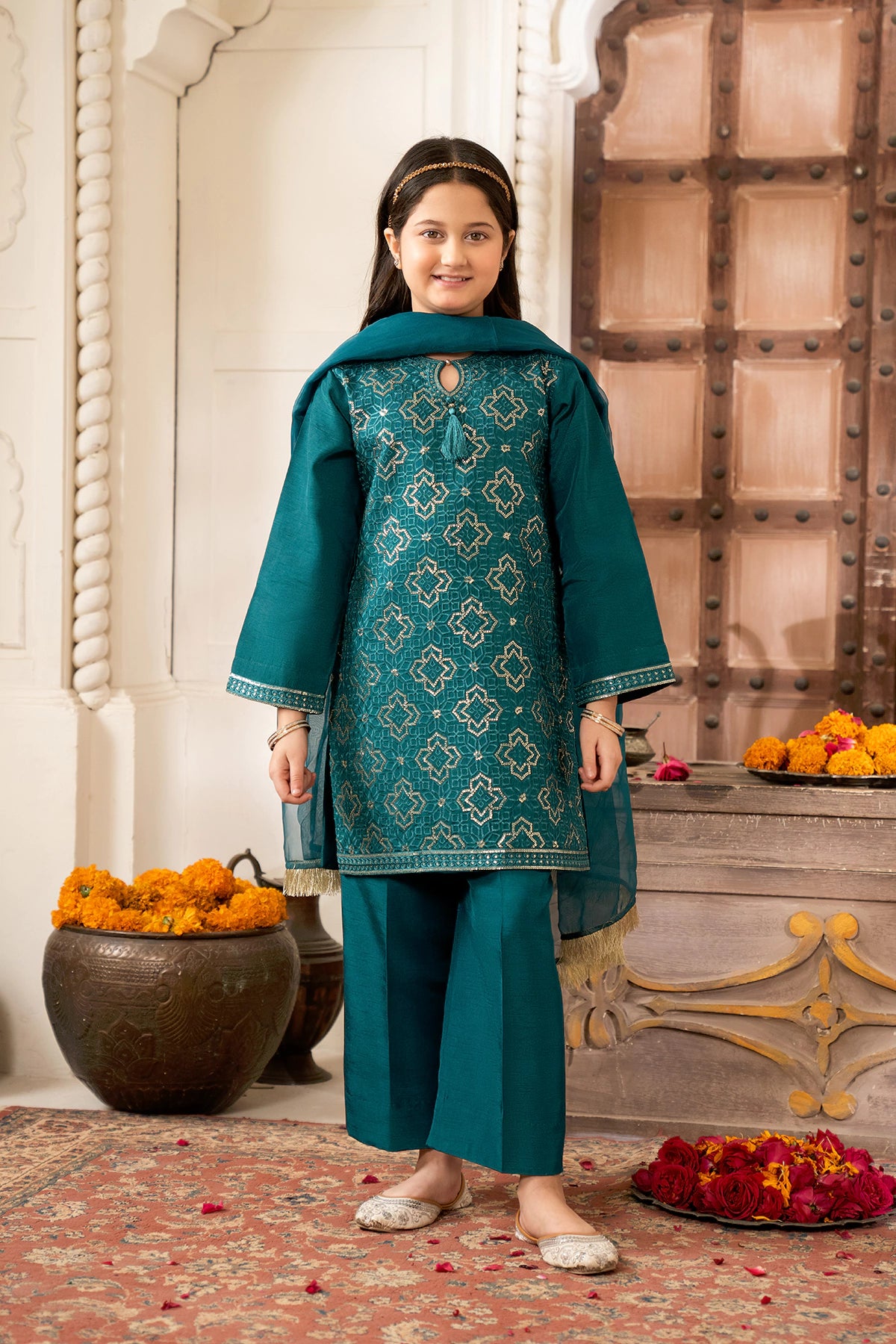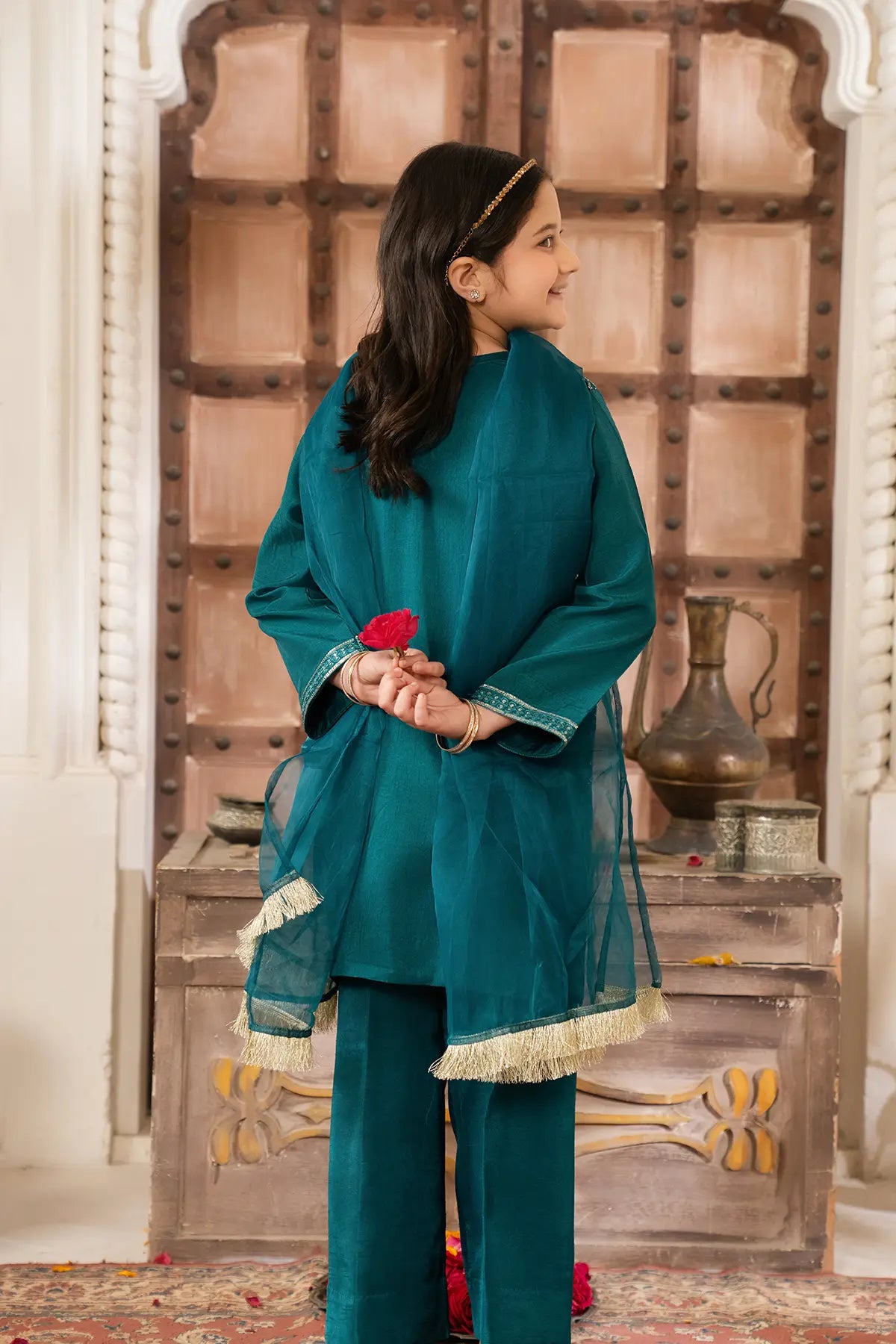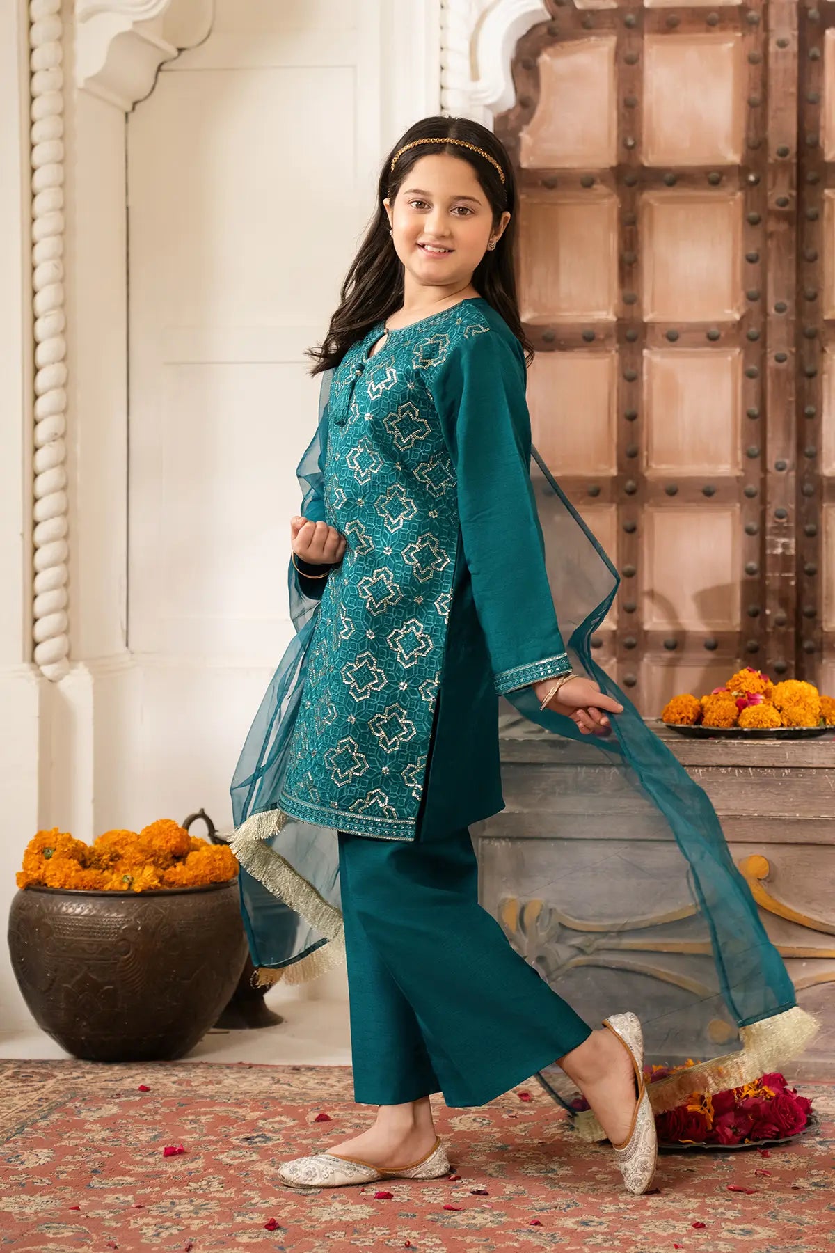 Part of our Exclusive Eid Edition, this luxuriously crafted ensemble features an intricately embroidered Sequin Tasal Silk shirt paired with a matching Tasal Silk embroidered trouser. The delicate Organza dupatta adds an ethereal finish, creating a timeless and graceful festive look for your little one.