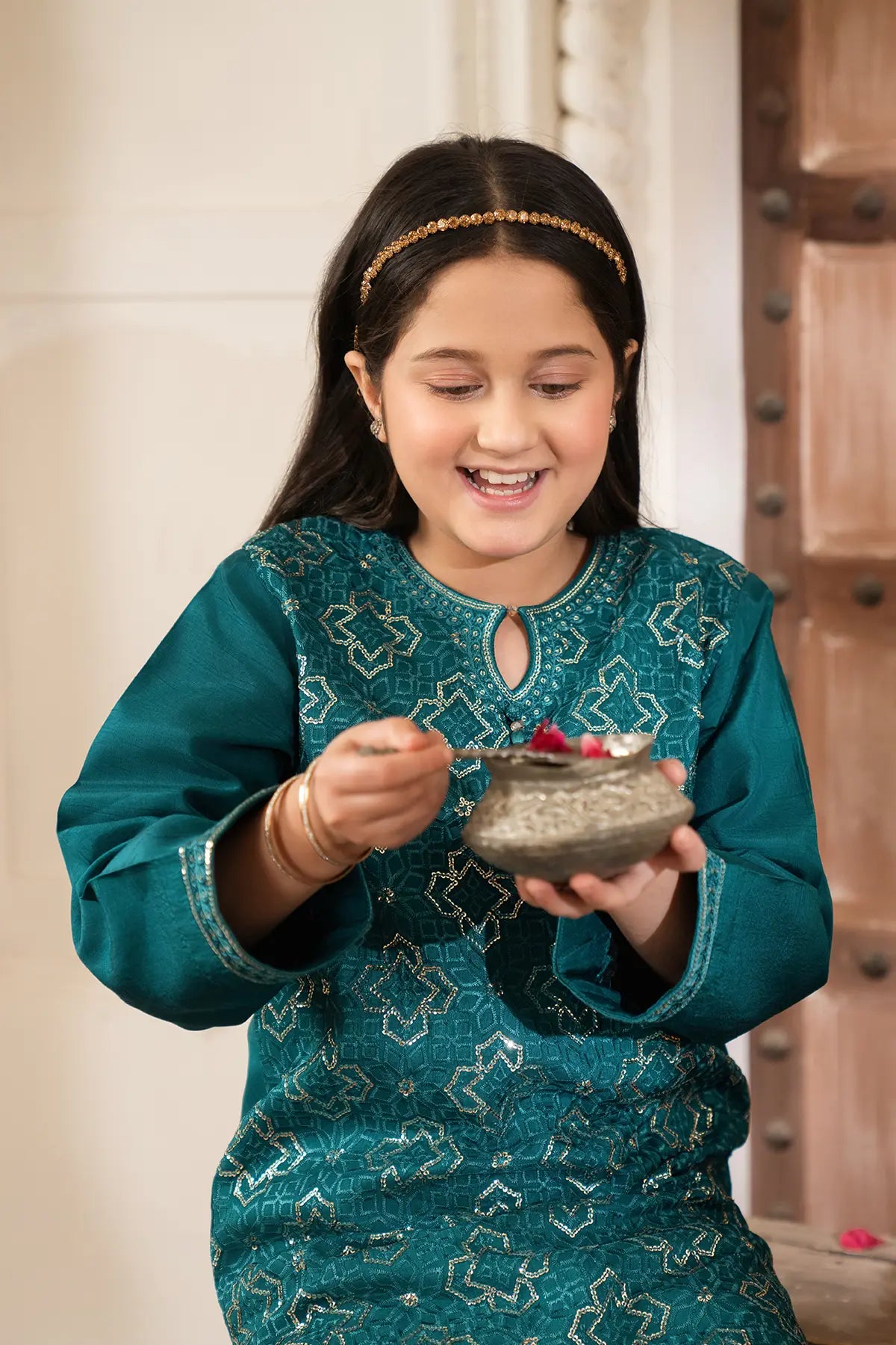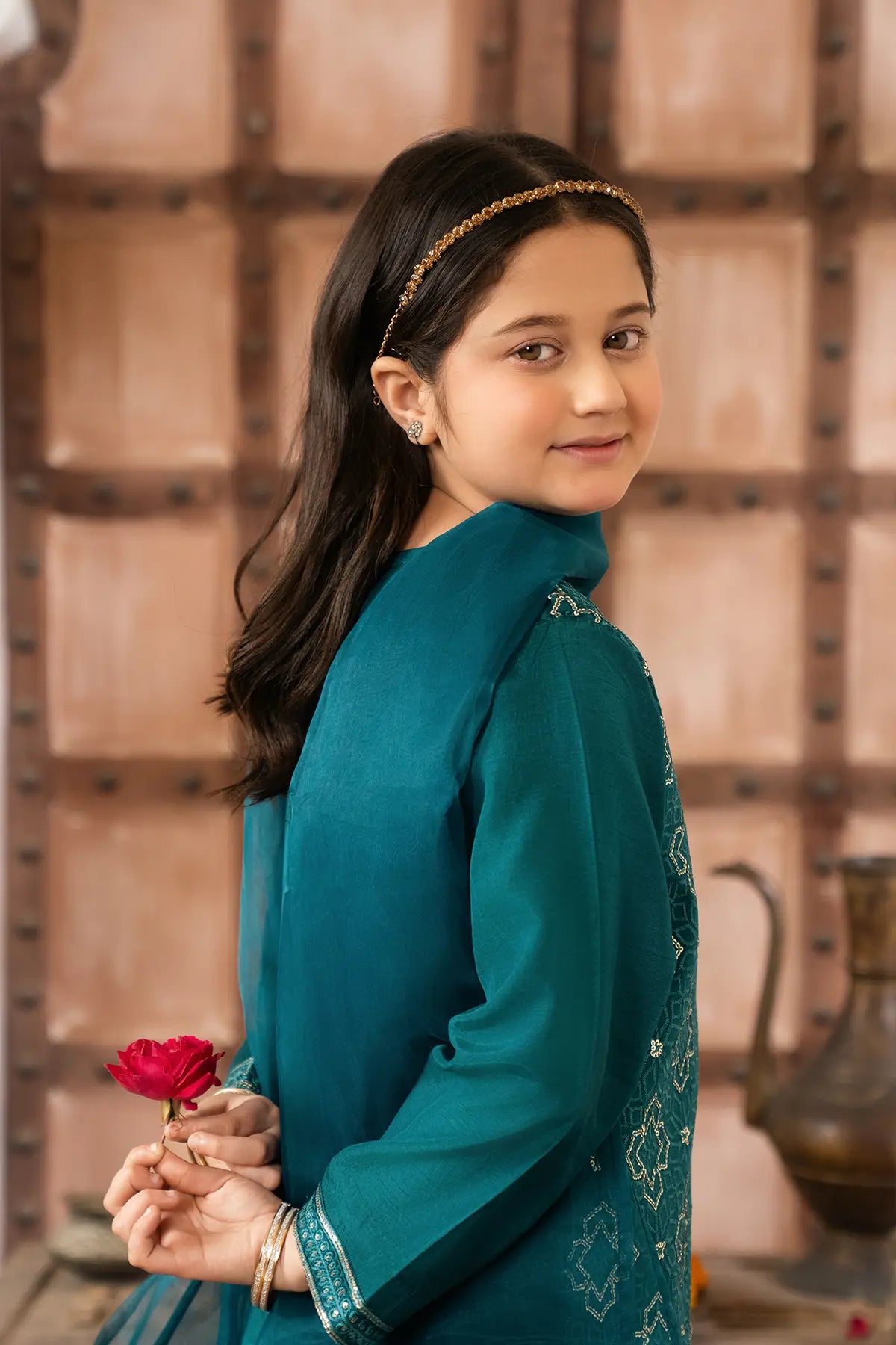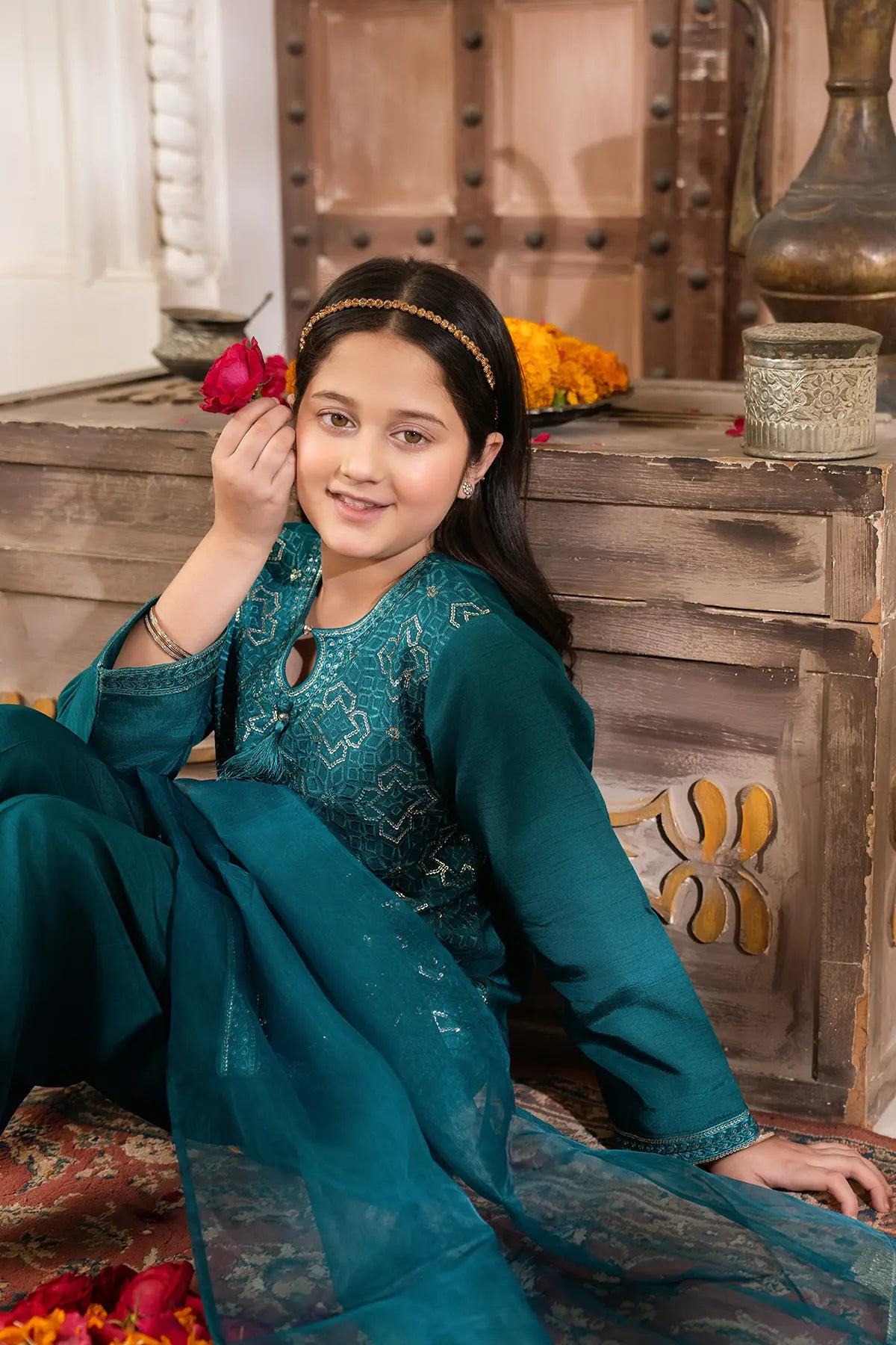 Part of our Exclusive Eid Edition, this luxuriously crafted ensemble features an intricately embroidered Sequin Tasal Silk shirt paired with a matching Tasal Silk embroidered trouser. The delicate Organza dupatta adds an ethereal finish, creating a timeless and graceful festive look for your little one.