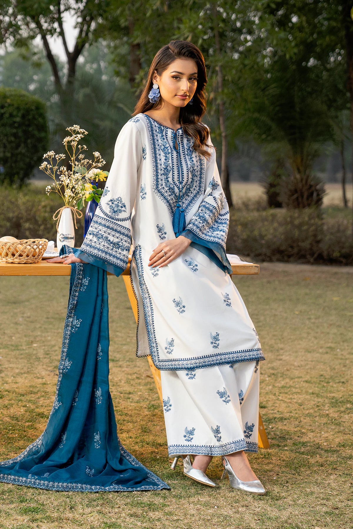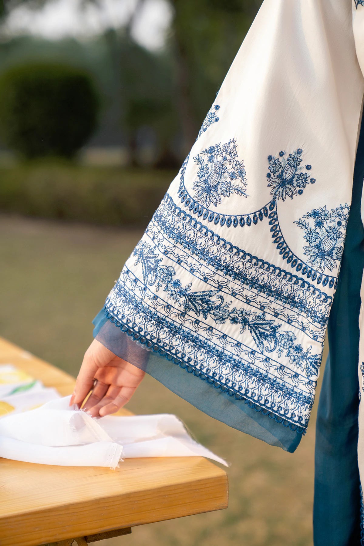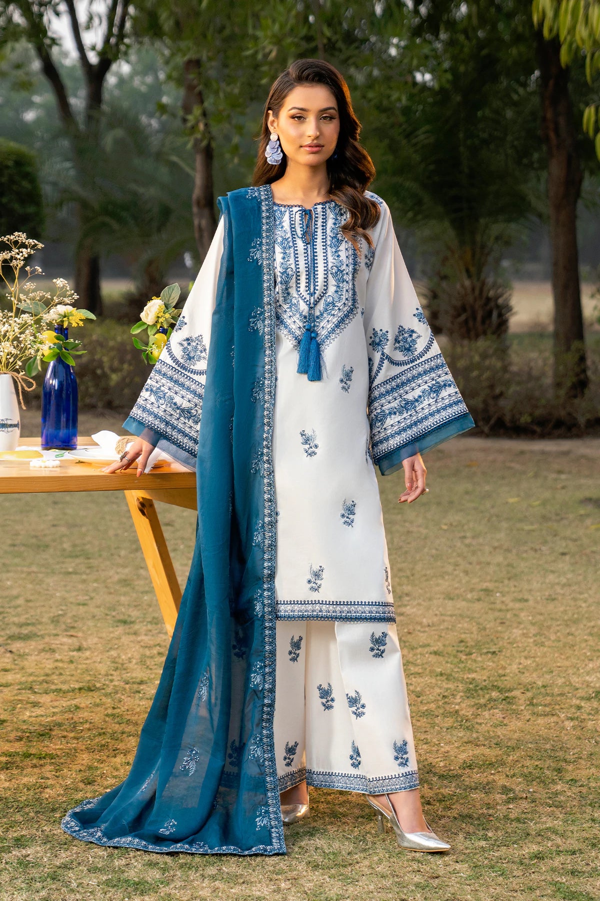 Where intricate craftsmanship meets festive grandeur.The embroidered lawn shirt exudes elegance, complemented by a finely tailored camric cotton embroidered trouser and an ethereal Silk Embroidered dupatta.Designed for the woman who embraces tradition with elevated grace.