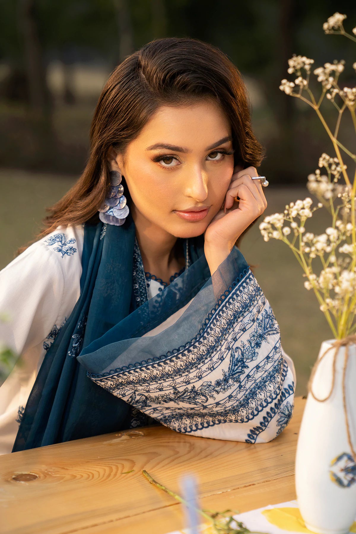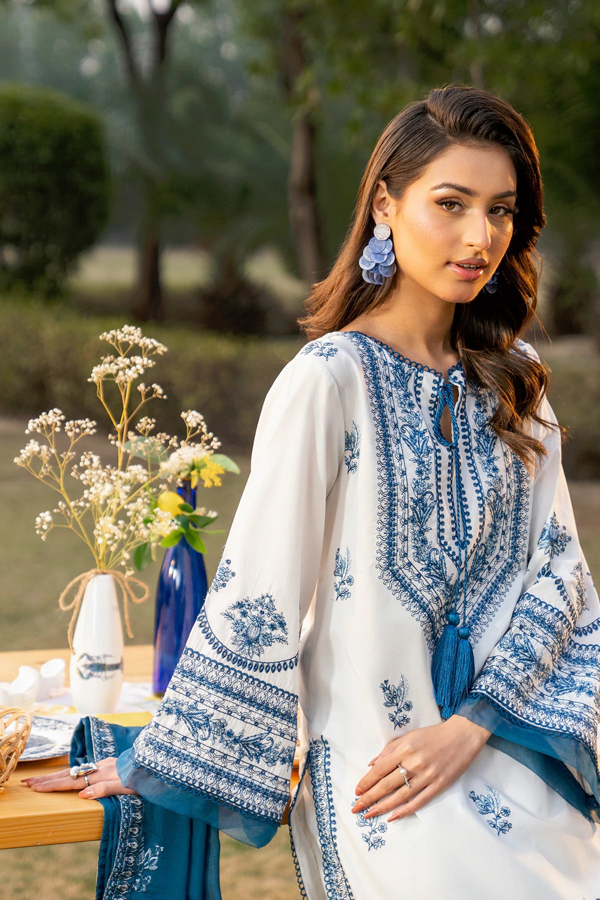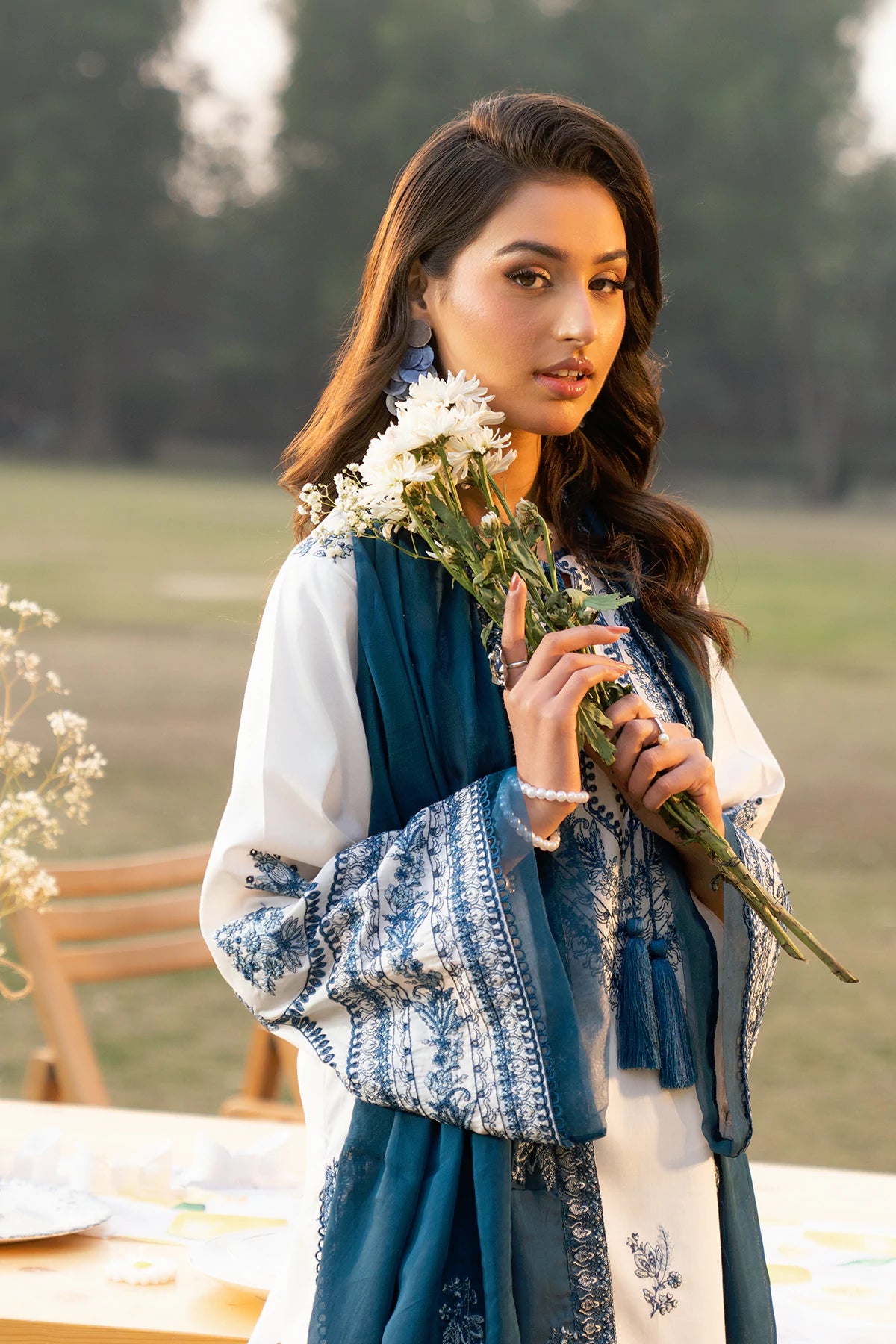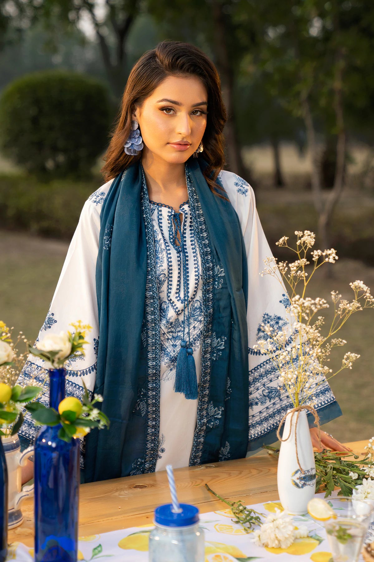 Where intricate craftsmanship meets festive grandeur.The embroidered lawn shirt exudes elegance, complemented by a finely tailored camric cotton embroidered trouser and an ethereal Silk Embroidered dupatta.Designed for the woman who embraces tradition with elevated grace.
