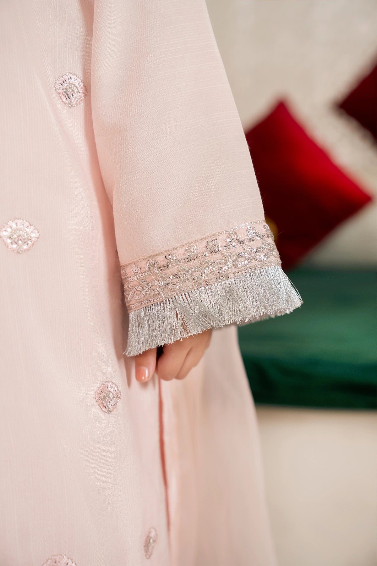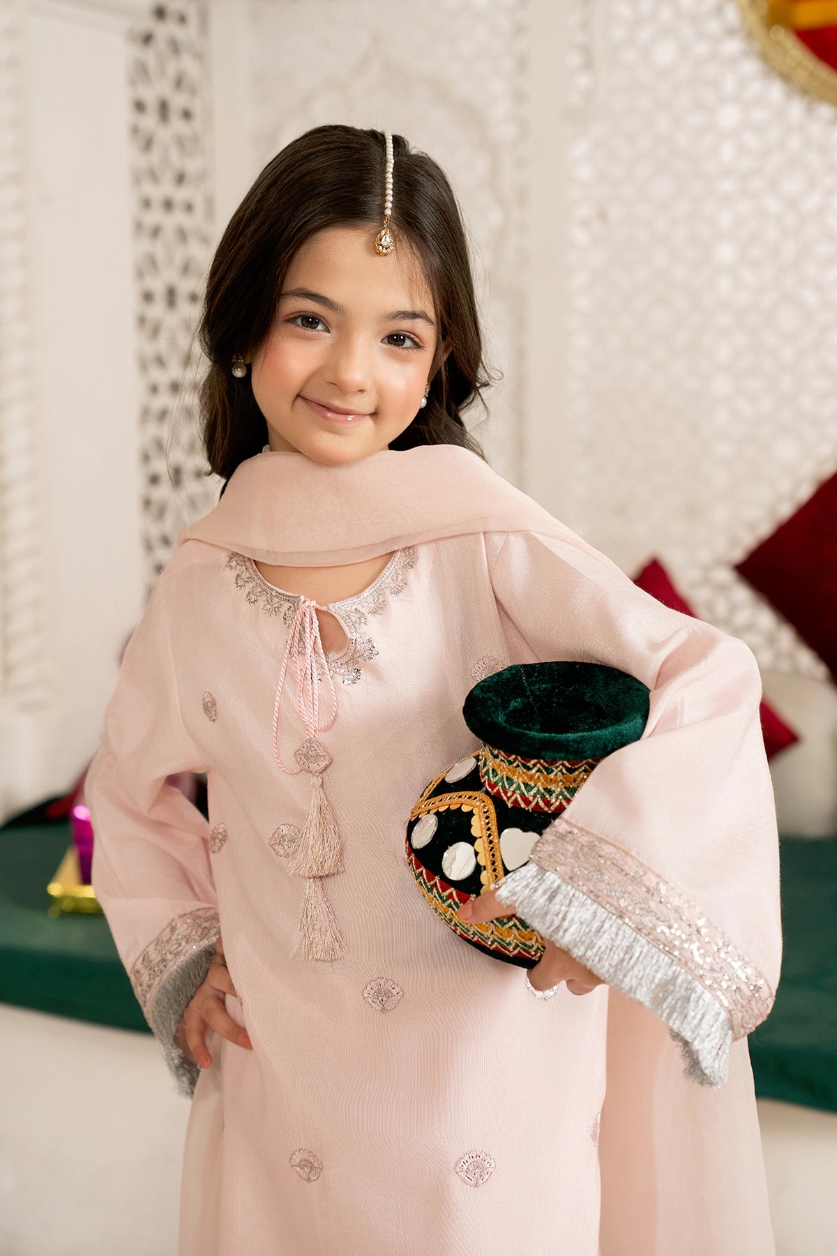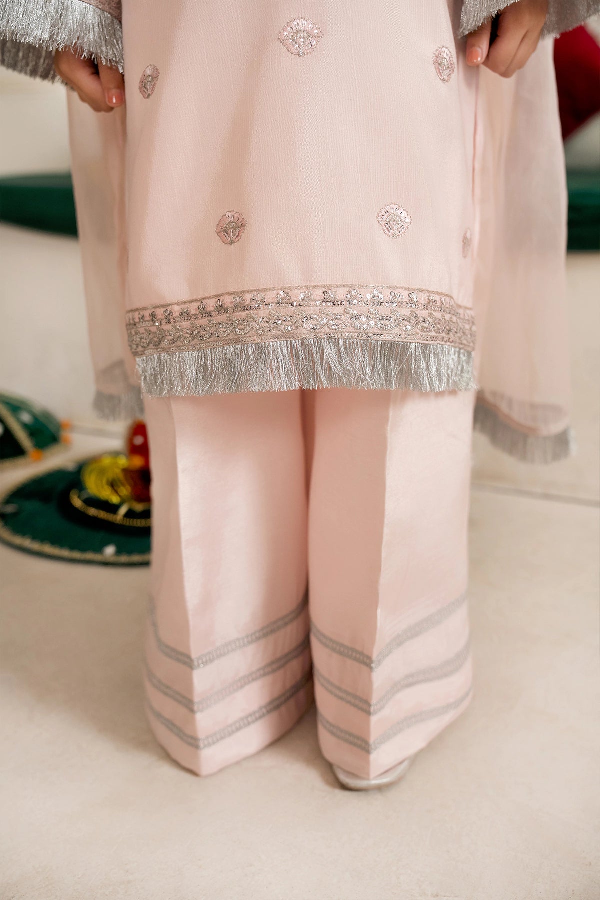 Part of our Exclusive Eid Edition, this luxuriously crafted ensemble features an intricately embroidered Tasal Silk shirt paired with a matching Tasal Silk embroidered trouser. The delicate Organza dupatta adds an ethereal finish, creating a timeless and graceful festive look for your little one.