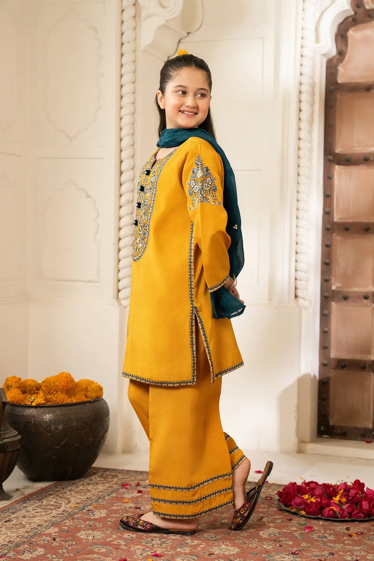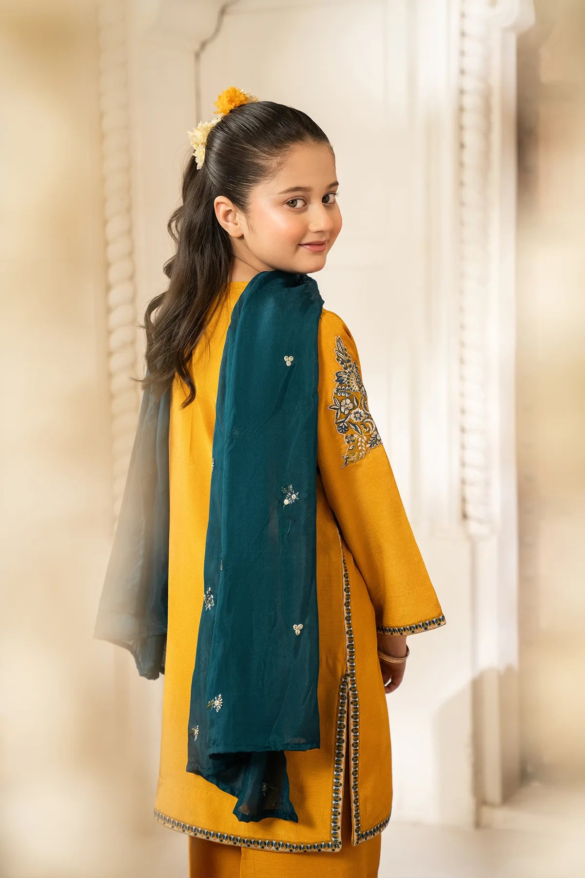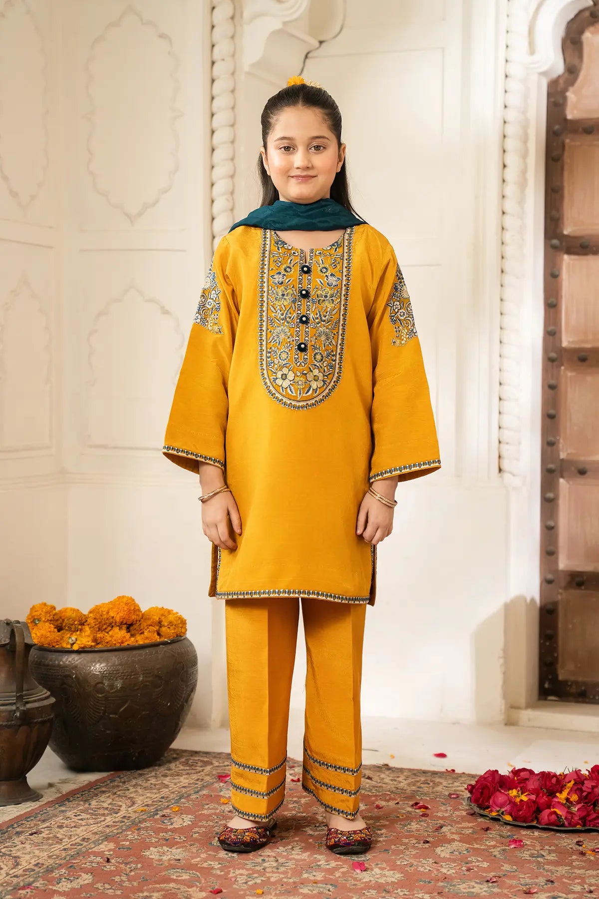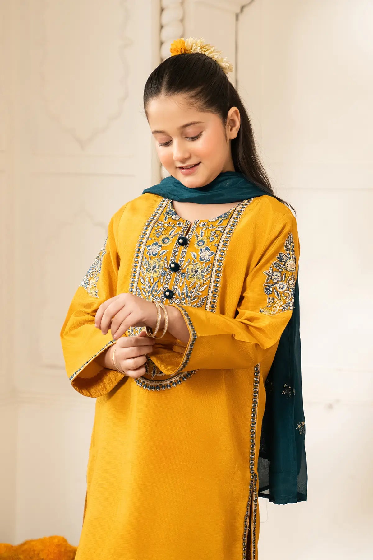 Part of our Exclusive Eid Edition, this luxuriously crafted ensemble features an intricately embroidered Tasal Silk shirt paired with a matching Tasal Silk embroidered trouser. The delicate net dupatta adds an ethereal finish, creating a timeless and graceful festive look for your little one.