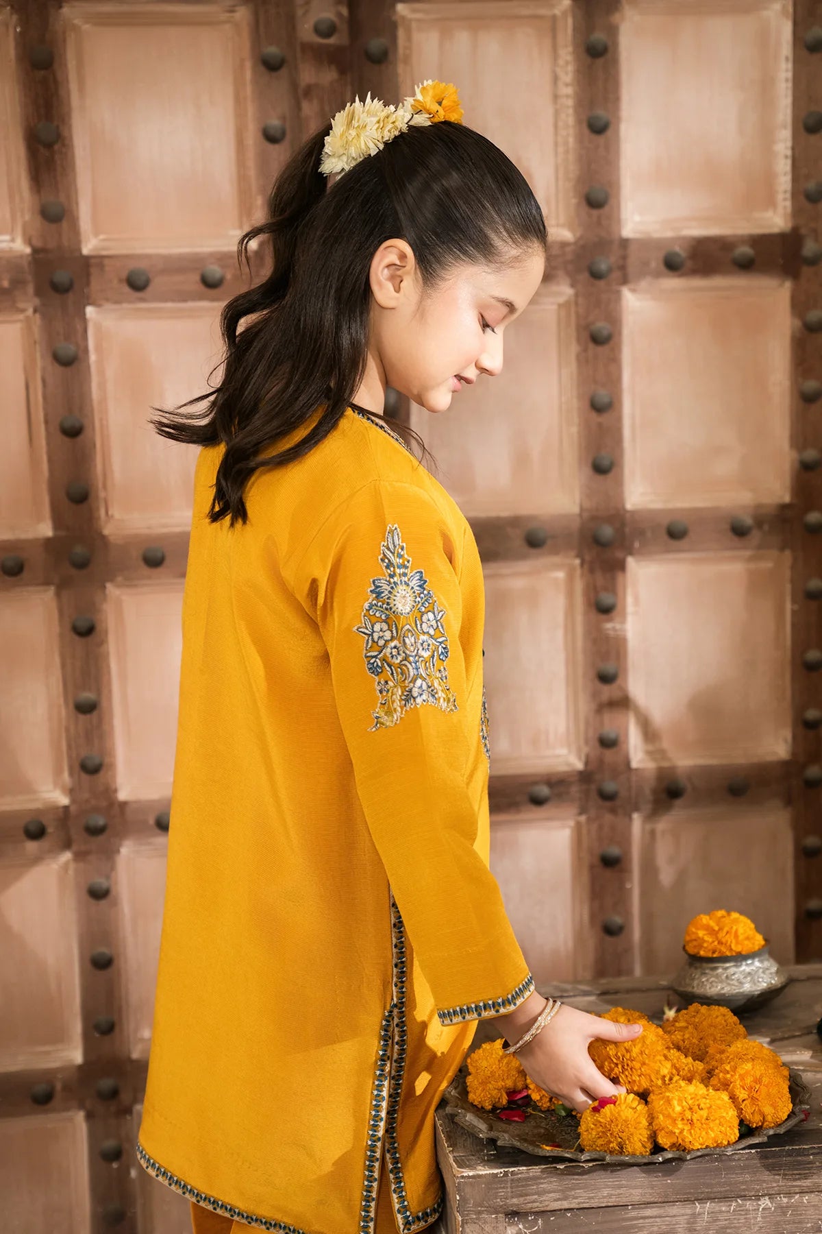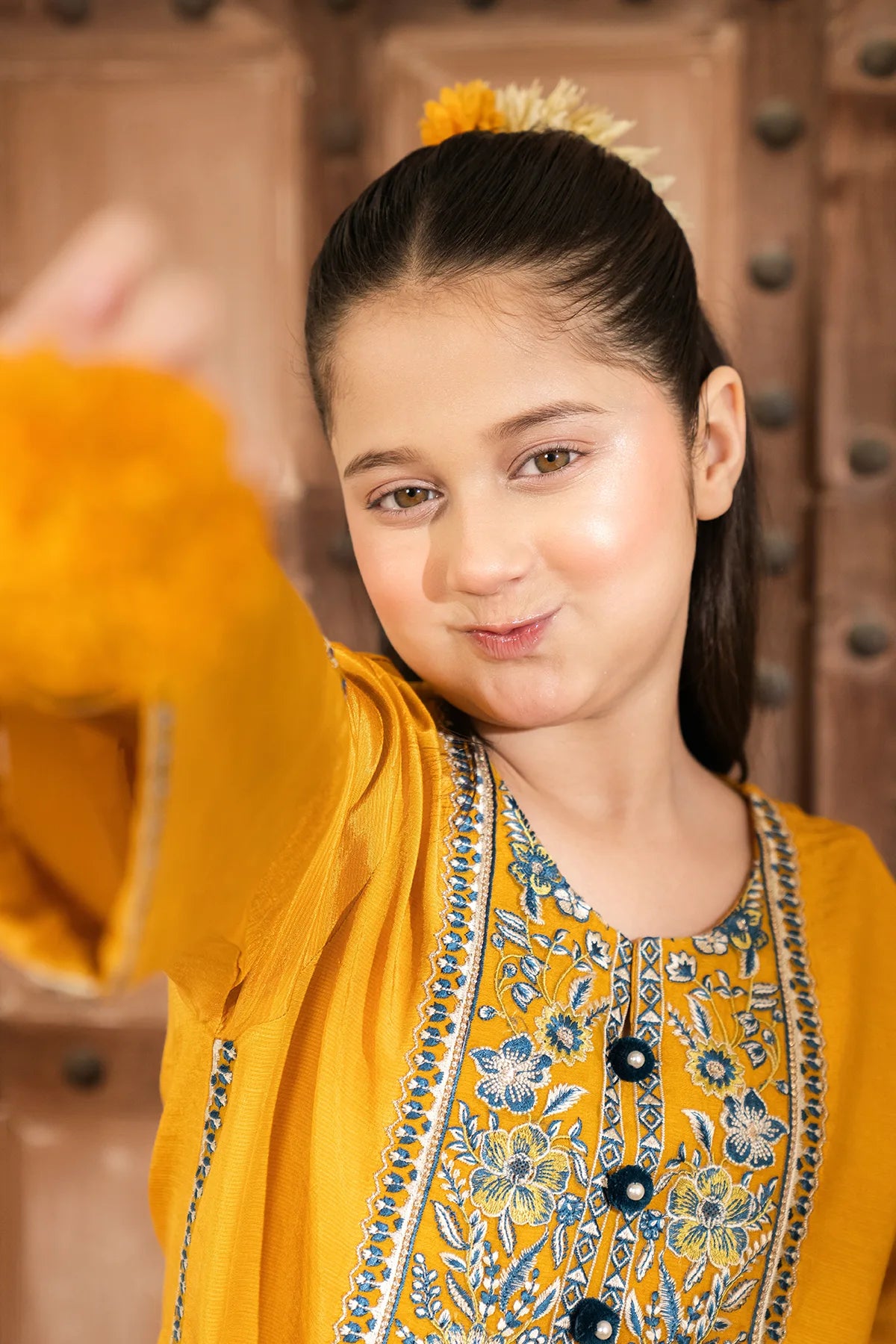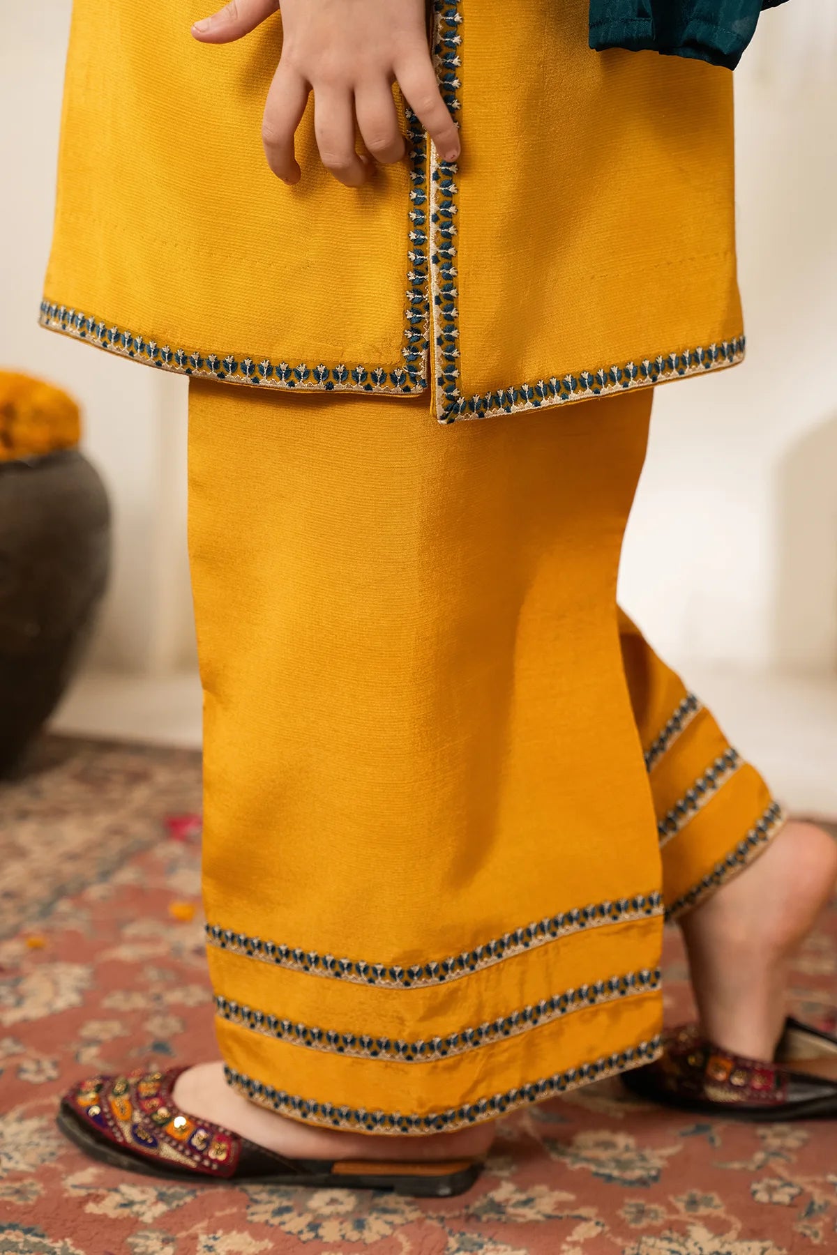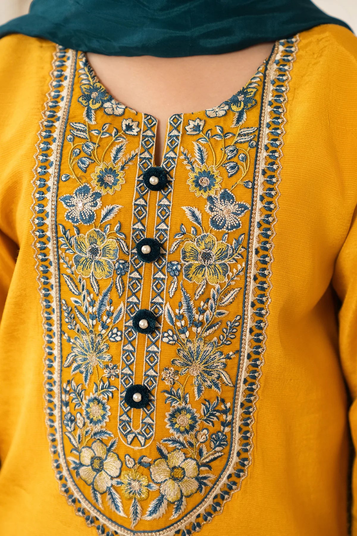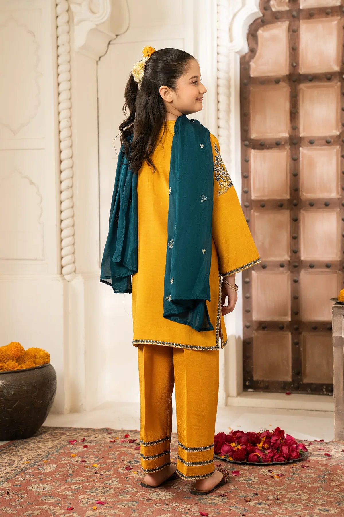 Part of our Exclusive Eid Edition, this luxuriously crafted ensemble features an intricately embroidered Tasal Silk shirt paired with a matching Tasal Silk embroidered trouser. The delicate net dupatta adds an ethereal finish, creating a timeless and graceful festive look for your little one.