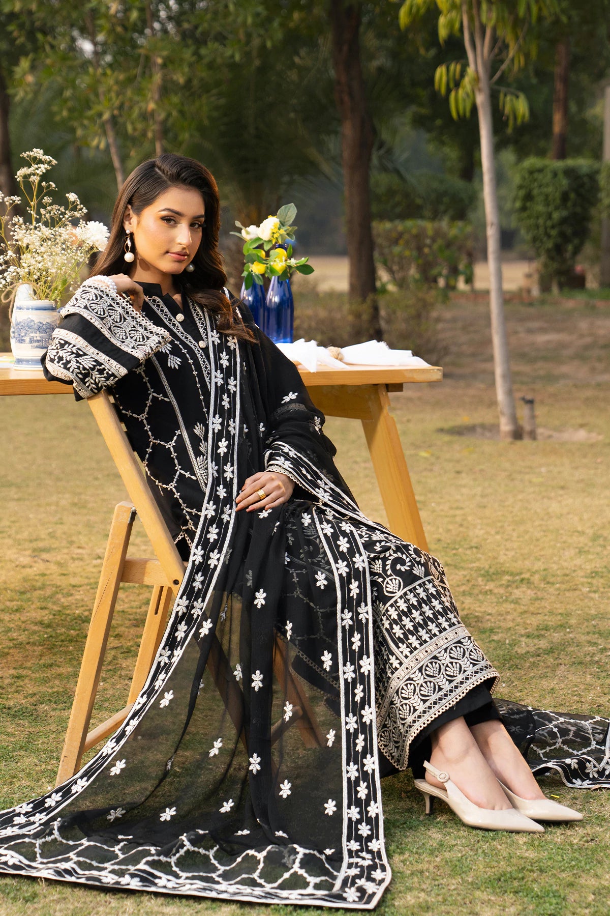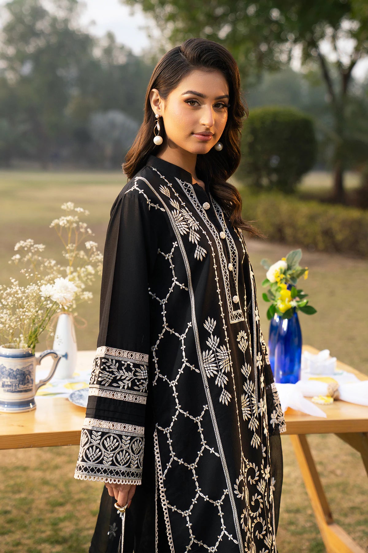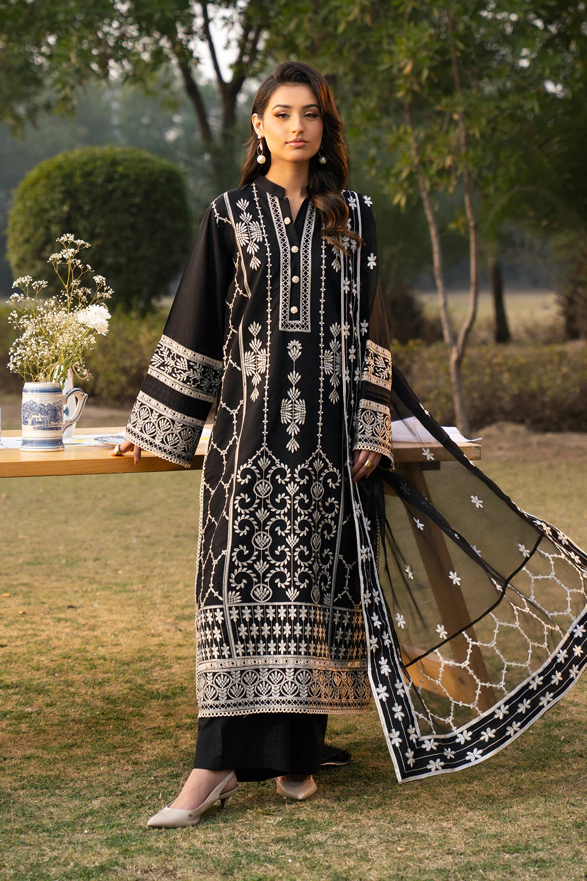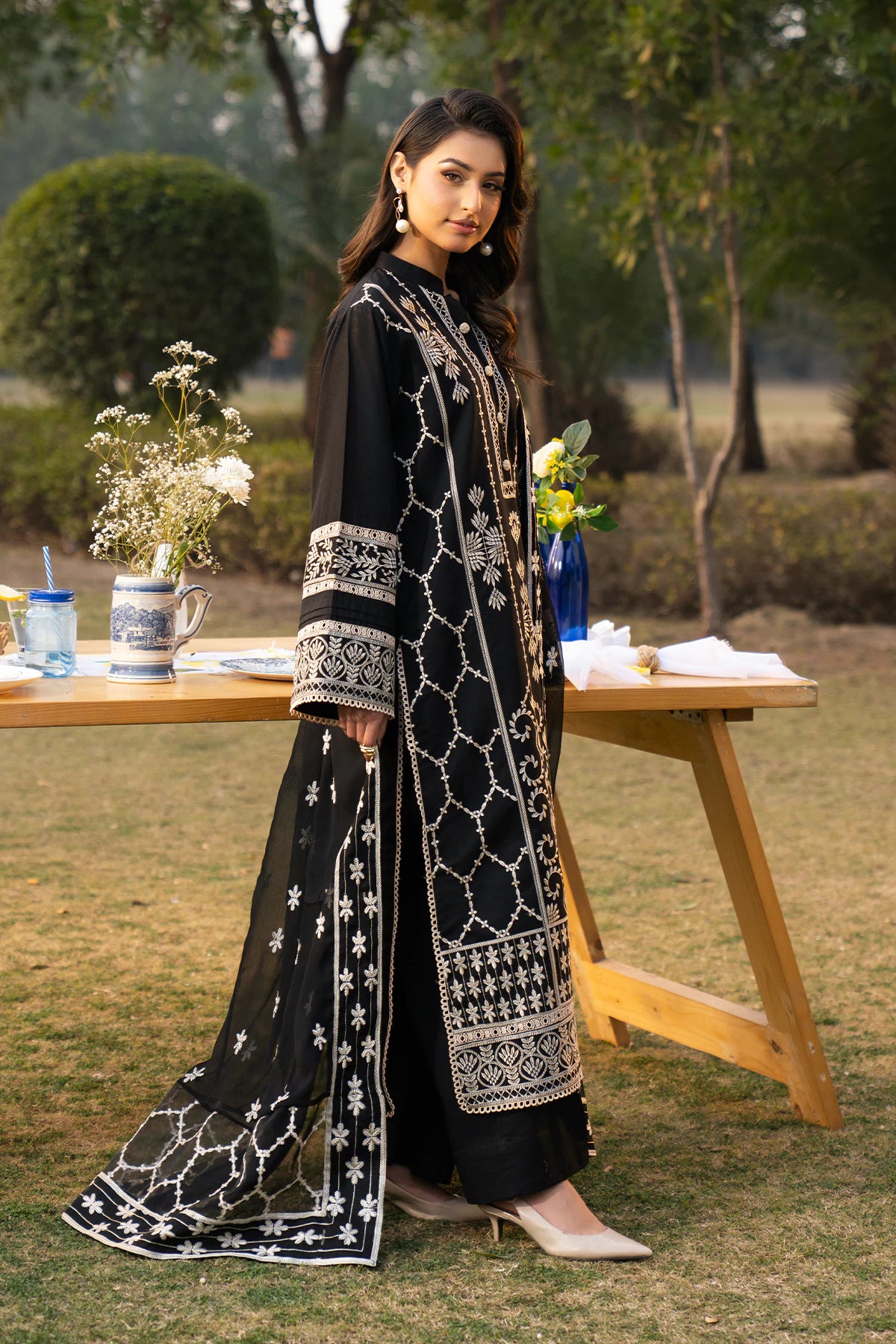 Where intricate craftsmanship meets festive grandeur.The embroidered lawn shirt exudes elegance, complemented by a finely tailored camric cotton trouser and an embroidered Khaddi Net dupatta.Designed for the woman who embraces tradition with elevated grace.
