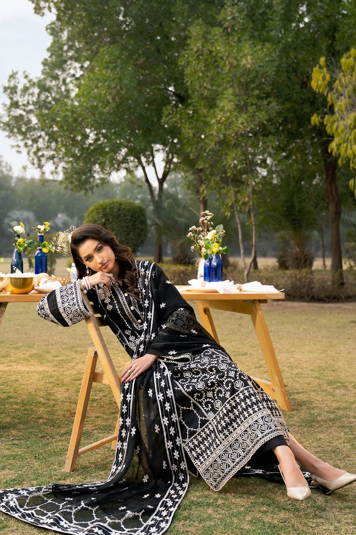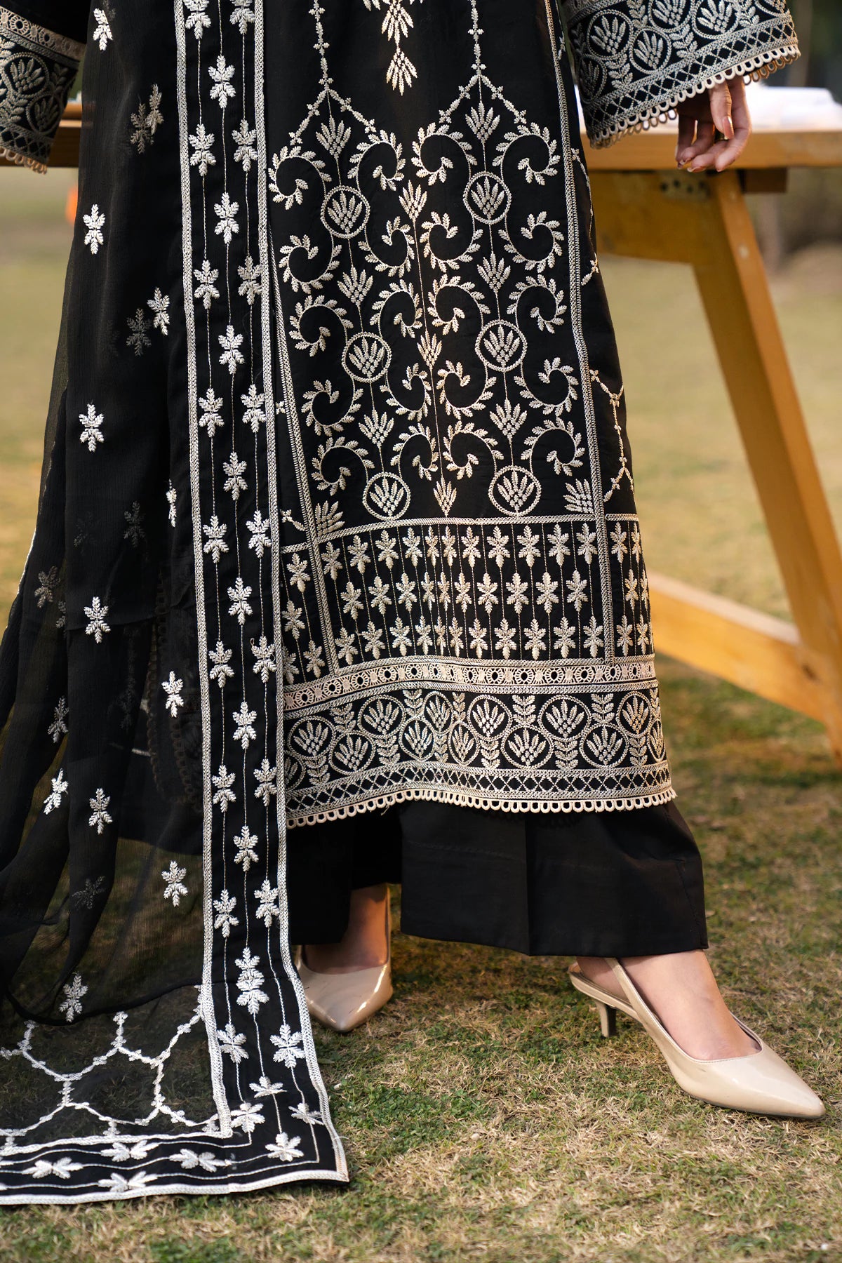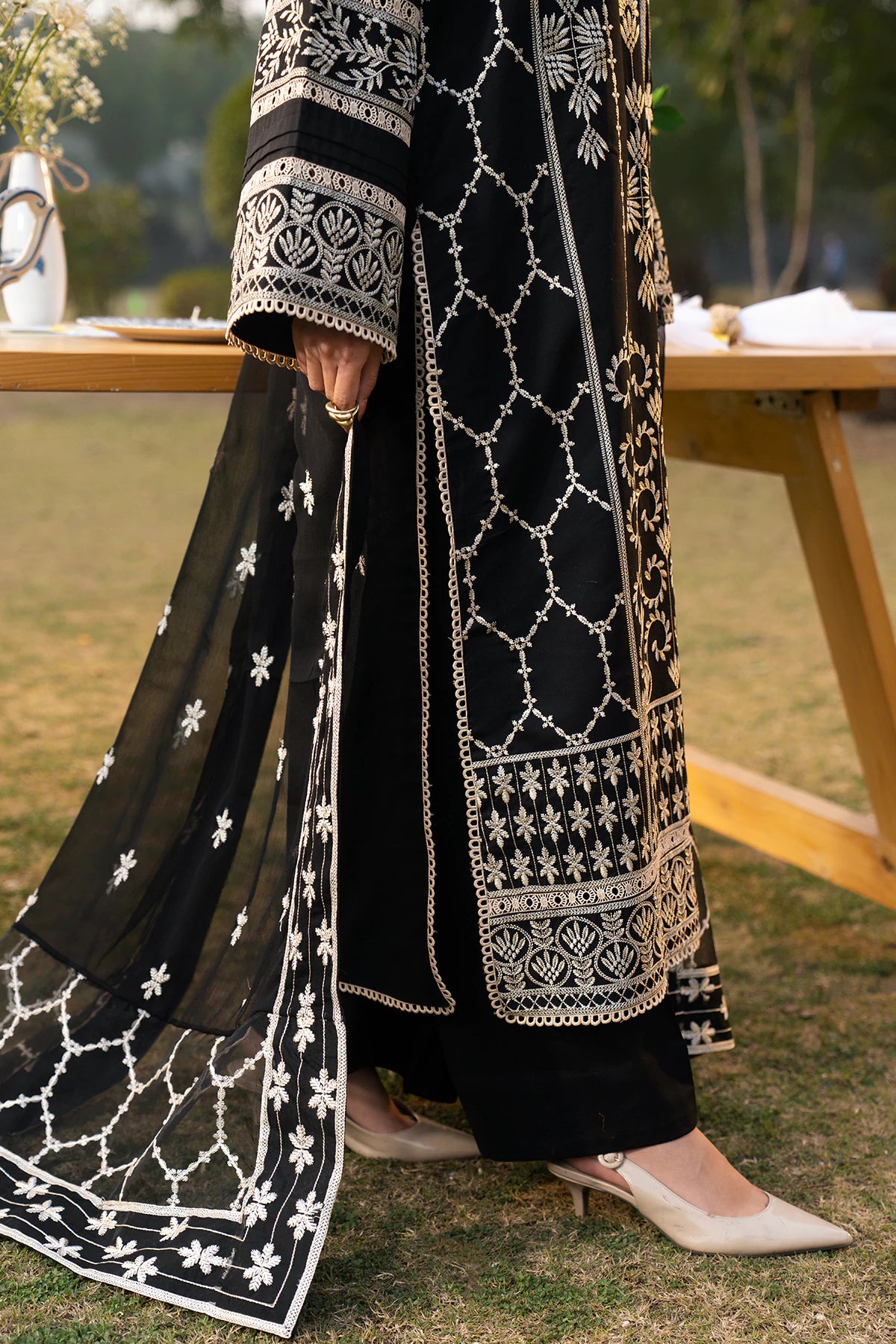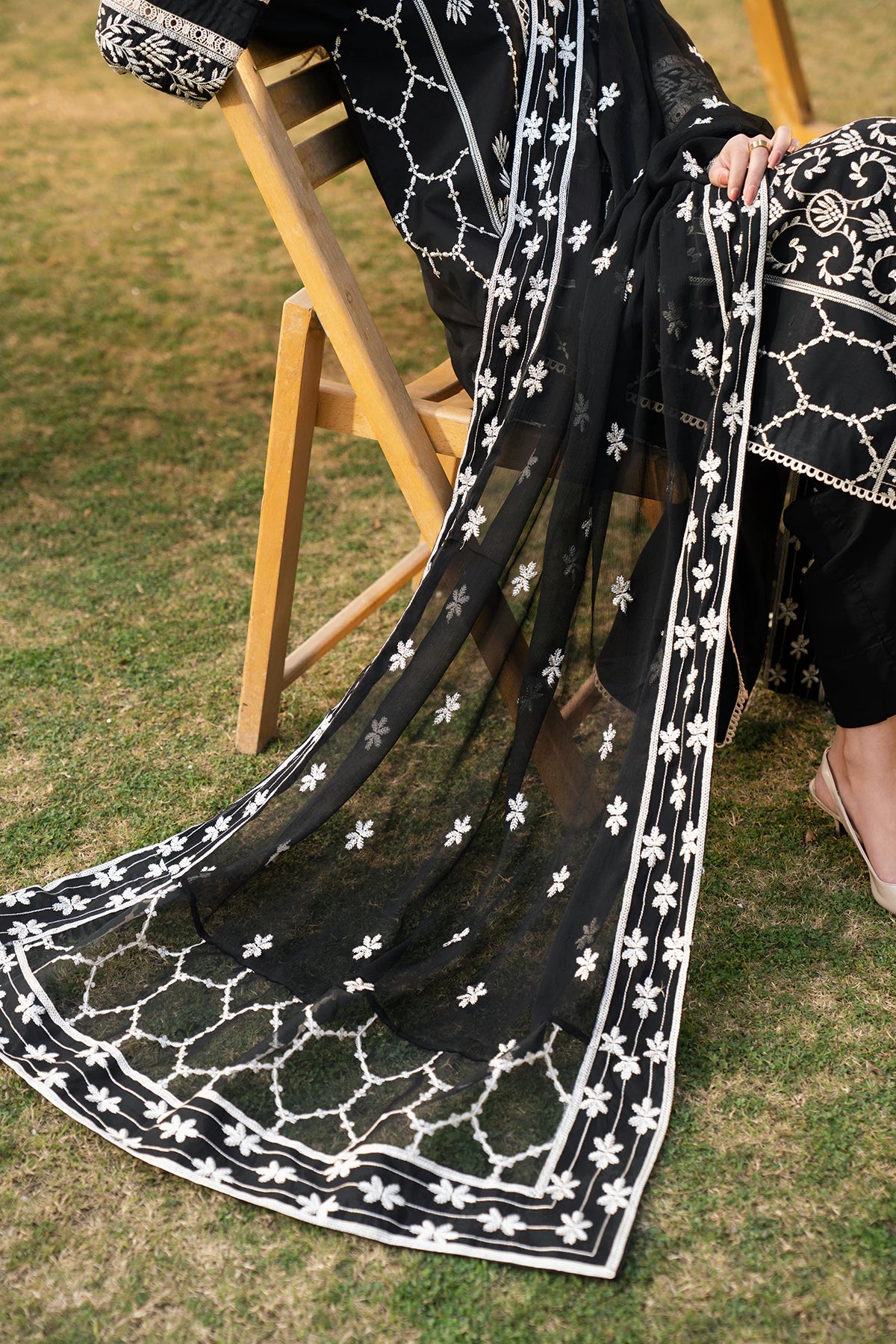 Where intricate craftsmanship meets festive grandeur.The embroidered lawn shirt exudes elegance, complemented by a finely tailored camric cotton trouser and an embroidered Khaddi Net dupatta.Designed for the woman who embraces tradition with elevated grace.